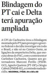 Mais um podre: Cachoeira e Demóstenes falam sobre depósitos em paraísos fiscais. Outro: Marcelo Miranda, eleito senador por Tocantins, mas impedido de tomar posse por decisão judicial, fazia parte do esquema Cachoeira. Aliás, um dos objetivos da CPI é verificar até onde se estendiam os tentáculos de Cachoeira no governo de Tocantins, tocado por Siqueira Campos (PSDB).