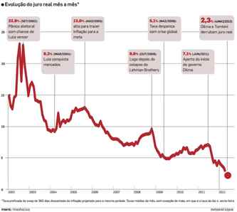 A intenção da presidente Dilma Rousseff de levar a taxa de juros real para 2% já foi quase cumprida, ainda faltando mais de dois anos e meio para o fim do seu mandato. Na sexta-feira, a principal taxa de juros de mercado de um ano, das transações envolvendo bancos e grandes empresas (e que baliza todas as outras taxas), caiu em termos reais para 2,3% ao ano.