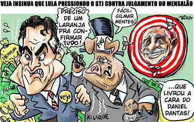 GILMAR MENTE. CAPÍTULO 1: EM COLUIO COM A VEJA DIVULGA MATERIA DIZENDO QUE LULA O SUBORNOU. CAPITULO 2: DEPOIS QUE LULA E NELSON JOBIM DESMENTE O CANALHA ELE DÁ ENTREVISTA À GLOBO DIZENDO QUE NÃO FOI BEM ASSIM E QUE LULA NÃO O CHANTAGEOU. CAPITULO 3: APÓS FICAR ACUADO COM A REPERCUSSÃO DO CASO VOLTA A ATACAR LULA DIZENDO QUE ELE É A CENTRAL DE DIVULGAÇÃO DE BOATOS CONTRA ELE. UMA PERGUNTA QUE NÃO QUER CALAR, QUAIS BOATOS SÃO ESSES QUE NINGUÉM VIU, SERÁ AS ESCUTAS GRAVADAS PELA PF NAS OPERAÇÕES QUE PEGARAM CACHOEIRA, QUE ESTÃO POR SEREM DIVULGADAS?. “GILMAR MENTE” ESTÁ DESESPERADO, ELE VAI MORRER QAFOGADO NA CACHOEIRA DE MAOS DADAS COM AQUELE LIXO QUE CHAMAM DE REVISTA VEJA.