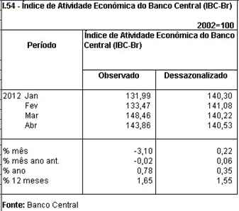 Segundo os números ajustados, portanto, o índice de atividade econômica cresceu 0,22% em abril (sobre o mês anterior), (0,06% sobre igual mês de 2011), 0,35% no acumulado do ano e 1,55% nos últimos 12 meses. Os números indicam crescimento modesto em abril, mas ainda sim crescimento, e devem ser analisados no contexto de todos os outros índices econômicos disponíveis: inflação, juros, emprego, produção industrial e agrícola, vendas no varejo.