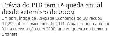 Tudo bem, acontece que a notícia é tendenciosa, e diz o contrário da informação principal. Segundo o Banco Central, o índice de atividade econômica em abril cresceu no mês, no ano e no acumulado 12 meses.