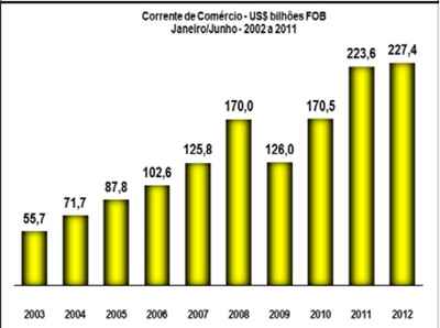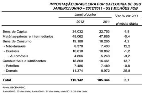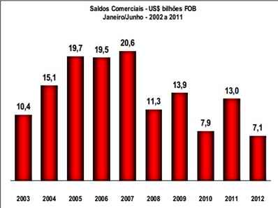 Acumulado de doze meses (Julho-2011/Junho-2012) Em períodos de doze meses, as exportações somaram US$ 254,951 bilhões. Sobre o período julho/2010-junho/2011, quando as exportações atingiram US$ 231,031 bilhões, houve crescimento de 10,4%, pela média diária. As importações totalizaram US$ 231,033 bilhões, aumento de 12,3% sobre o mesmo período anterior, de US$ 205,805 bilhões, pela média diária. O superávit comercial, em doze meses, acumula cifra de US$ 23,918 bilhões, valor 5,2% abaixo de equivalente período anterior (US$ 25,226 bilhões). A corrente de comércio cresceu em 11,3%, pela média diária, de US$ 436,836 bilhões para US$ 485,984 bilhões.