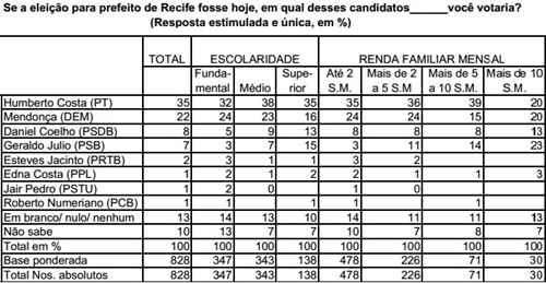 Entre os que tem ensino superior, Humberto Costa tem 35% das intenções de voto, contra 24% de Mendonça (DEM), e 13% do Daniel Coelho (PSDB) e 15% do Geraldo Julio, a aposta de Eduardo Campos depois que o PT se viu às voltas com um período de desagregação interna.