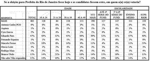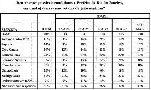 Observe que Paes tem uma rejeição que cresce entre os mais jovens. Entre os jovens até 24 anos, 31% responderam que não votariam de jeito nenhum no prefeito.