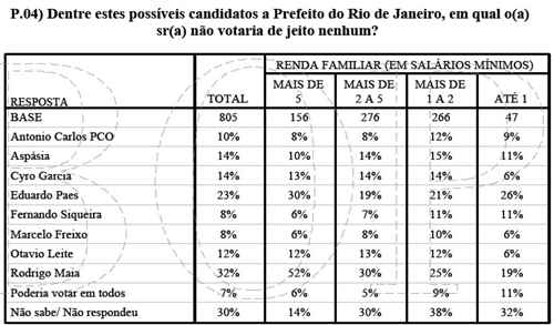 Rodrigo Maia, candidato pelo DEM, ou seja, pelo partido mais conservador, tem uma rejeição de 52% entre as famílias com renda superior a 5 salários. Freixo tem apenas 6% de rejeição nessa mesma faixa. Eduardo Paes tem 30% de rejeição entre os mais ricos.