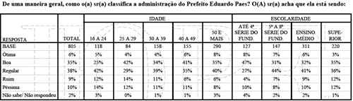 Mesmo entre os jovens até 24 anos, Paes em aprovação de 51%, contra 43% de desaprovação. Tem uma aprovação muito grande entre os que tem até a quarta-sério do ensino fundamental: 75%, mas ganha também entre aqueles com ensino superior: 54%.