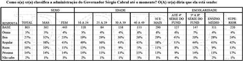 Um fato curioso: a avaliação de Cabral é bem melhor entre homens do que mulheres. Repare que 37% dos homens acham sua administração boa ou ótima, enquanto apenas 27% das mulheres acham o mesmo. O escândalo de Paris, possivelmente, contribuiu para este quadro. Cabral tem excelente perfomance entre eleitores com escolaridade até o ensino fundamental. Entre os mais instruídos, temos 28% que consideram sua gestão boa ou ótima, e 30% que a consideram ruim ou péssima, com 42% dando nota regular. De maneira geral, a avaliação de Cabral não é boa nem ruim, mas regular.