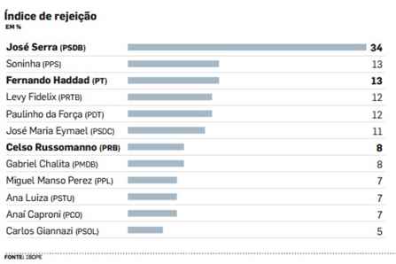 O candidato do PSDB é o líder no quesito rejeição – 34% dos entrevistados afirmaram que não votariam nele de jeito nenhum. Russomanno tem 8% e Haddad, 13%.