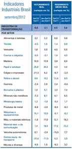 O setor de Máquinas e equipamentos teve forte aumento do faturamento (15,1%) em setembro de 2012, frente ao mesmo mês do ano anterior. O aumento desse indicador foi o segundo maior da indústria de transformação (atrás apenas de Papel e celulose). Uma vez que esse setor produz bens para fins de investimento, a expansão do faturamento pode indicar que os investimentos podem estar entrando em uma trajetória de recuperação.