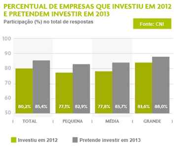A CNI também pesquisou a intenção de investimento dos empresários brasileiros e descobriu que 85,4% pretendem investir em 2013, contra um total de 80,2% que efetivamente investiou em 2012.