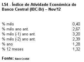 Também esta semana, o Banco Central divulgou a sua estimativa para o crescimento econômico em novembro, e os números surpreenderam positivamente: crescimento de 0,4% em novembro, sobre o mês anterior; 2,67% sobre mesmo mês de 2012. Crescimento inclusive de 3,2% sobre novembro de 2010, que foi um ano extraordinário. Os dados estão ajustados sazonalmente. Em 12 meses, o crescimento continua baixo, 1,32%, mas a tendência é que este número cresça substancialmente ao longo dos próximos meses.