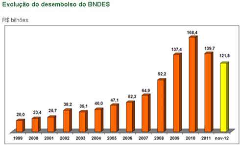 O BNDES terminou a era tucana desembolsando R$ 38,2 bilhões em 2002 (e olha que era ano eleitoral). Em 2012, até novembro, já desembolsou R$ 121,8 bilhões.