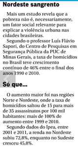 Gois poderia dar uma olhada no Estadão do mesmo domingo, onde há reportagem que também “revela” uma realidade ainda dura para os brasileiros. Apesar da melhora de inúmeros índices sociais, o saneamento básico experimentou uma melhora insignificante. Obviamente, há milhares de brasileiros que não se conforma com isso e mergulham no perigoso mundo do crime. A situação é particularmente grave no Nordeste, o que explicaria a aparente contradição trazida por Gois.