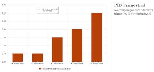 O IBGE divulgou hoje o crescimento do PIB no ano passado, que foi de 0,9%, um lamentável pibinho. Mas antes de cortar os pulsos e ajoelhar no altar da Miriam Leitão, tentemos ver o lado positivo. O pior já passou. O crescimento do PIB no último trimestre de 2012 foi o segundo maior do mundo (sic), e todos os gráficos mostram uma vigorosa recuperação da economia brasileira.