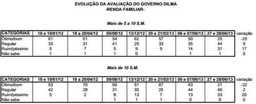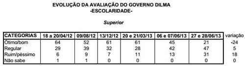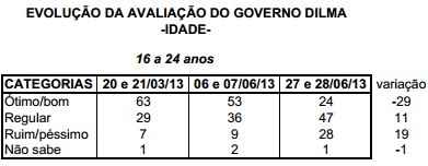 A queda na avaliação é brutal demais. Não costumo desconfiar de institutos de pesquisa, mas desta vez fiquei com uma pulga atrás da orelha. Será que pesquisaram apenas junto aos manifestantes? Bem, de qualquer forma, deixemos isso pra lá e vamos às análises. Separei algumas tabelas que, na minha opinião, apontam os pontos mais sensíveis de Dilma.