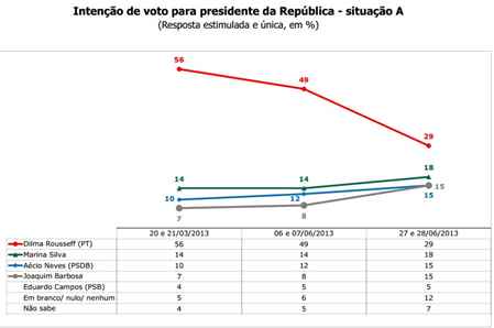 A queda na intenção de votos em Dilma também é brutal. O maior herdeiro de seus votos é Joaquim Barbosa, em seguida, os votos em branco ou nulos.