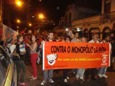 Dessa vez foi uma manifestação quase poética, que reuniu de oitenta a cem pessoas. Fizemos um protesto pequeno, mas gigante em sentido, beleza e contexto histórico. Havia uma bandinha que tocou marchas famosas. Um carro de som onde as pessoas faziam discursos. Substituímos o nome da rua Irineu Marinho para Leonel Brizola. Lançamos grandes bolinhas de papel jornal na parede do edifício. Um operador seguia no alto do carro projetando vídeos de discursos do Brizola nas fachadas dos prédios. Ao final, foi realizada uma assembléia popular para discutir objetivamente o que deve ser feito para modernizar e democratizar a mídia.