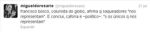 Eis como Bosco encerra o texto que motivou minha última divergência: “Portanto, respondendo novamente à pergunta da PM, quem está tentando saquear lojas está, precisamente, reivindicando um país melhor. E eles nos representam. São os únicos que realmente nos representam.”