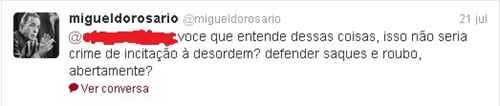 Agora começaram uma campanhazinha suja contra mim, acusando-me de “denunciar militantes de esquerda para a polícia”. Ficam disparando tweets, tentando manchar minha reputação. O mundinho do twitter é cruel, porque as pessoas nem vêem o contexto, só lêem que fulano é “alcagueta de militantes de esquerda”. A denúncia partiu por causa de dois tweets que escrevi: