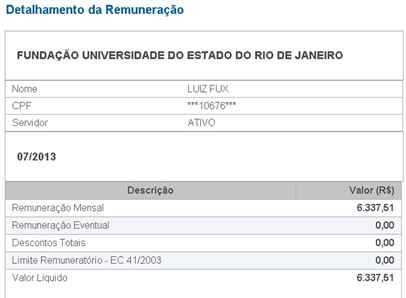 Bem, seja como for, acabo de obter uma informação que ajuda a confirmar a denúncia sobre Joaquim Barbosa e a UERJ. Não foi difícil, confesso. Recebi um email de um leitor indicando-me um link do próprio governo do estado. E o que vi? Que o colega de Joaquim Barbosa, o ministro Luiz Fux, está “ativo” na UERJ e continua recebendo salários. Em julho, recebeu da UERJ um total de R$ 6.337,51. Em junho, recebeu R$ 9.351,14.