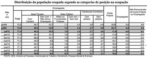 Entretanto, tão importante quando o declínio do desemprego, é a melhora de sua qualidade. Nos últimos 10 anos, o quadro do emprego no Brasil apresentou melhora sensível. No país, o percentual de empregados com carteira assinada no setor privado saltou de 39,7% em julho de 2004 para 50% em julho de 2013.