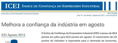 A opinião de Andrade é confirmada estatisticamente. O índice de confiança do industrial, apurado mensalmente pela CNI, registrou alta substancial em agosto.