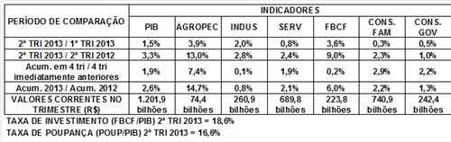Observe que o PIB do segundo trimestre, além de crescer robustos 1,5% sobre o trimestre anterior, cresceu 3,3% sobre o mesmo período de 2012. A indústria e investimento (FBCF) cresceram vigoramente, 2,0% e 3,6%, respectivamente. Na comparação com o ano passado, o investimento cresceu 9%.