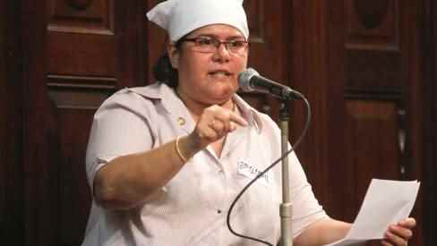 A deputada estadual Janira Rocha (PSOL-RJ) acaba de ajustar um guardanapo branco em sua cabeça.