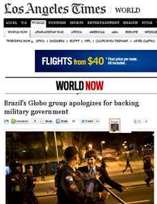 Só na imprensa internacional, no Los Angeles Times, encontro uma matéria que aborda os protestos contra a Globo e o seu pedido de desculpas.