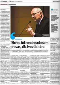 O exemplo mais estrondoso veio de Ives Gandra, jurista e autor de dezenas de livros sobre Direito, que se tornou célebre na mídia por suas invectivas contra o PT. Neste domingo, Gandra chuta o pau da barraca e diz, em entrevista para Monica Bergamo, na Folha, que Dirceu foi condenado sem provas.