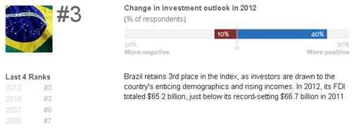 A avaliação que a consultoria faz do Brasil é ultra-positiva: 40% de razões para otimismo, contra apenas 10% para pessimismo. Os investidores têm sido atraídos por nossa demografia espetacular (muitos jovens em idade produtiva) e pelo aumento da renda dos trabalhadores. Em 2012, o investimento estrangeiro direto no Brasil, segundo a empresa, foi de US$ 65,2 bilhões, só um pouquinho abaixo do recorde registrado no ano anterior, de US$ 66,7 bilhões.Nesses primeiros dois anos do governo Dilma, os investimentos estrangeiros diretos (ou seja, em produção; não em especulação) foram os maiores da história.