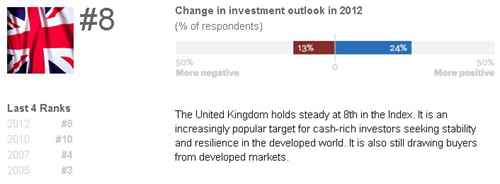 A Inglaterra também não pode chorar de barriga cheia. Recebeu US$ 62,7 bilhões de investimentos estrangeiros diretos em 2012. Mas entende-se a choradeira: em 2008, recebeu quase US$ 90 bilhões. A avaliação que a ATKearney faz do Reino Unido, em matéria de atração aos investidores, é menos positiva, porém, que a do Brasil: apenas 24% de razões positivas, contra 13% negativas.