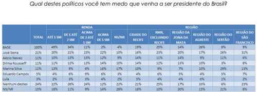 A rejeição de Serra é um fenômeno ao qual Pernambuco não escapa. Mas é interessante notar que Aécio, mesmo tão pouco conhecido, tem rejeição maior que Dilma Rousseff. Marina Silva também tem uma rejeição curiosa em alguns segmentos. Entre os moradores do Sertão, por exemplo, ela é a mais rejeitada entre os candidatos – o que pode atrapalhar Campos.