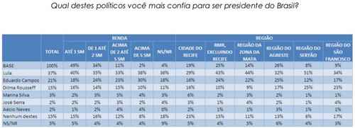 Lula continua sendo o político mais confiável entre os pernambucanos (37%), seguido de Campos (21%) e Dilma (15%). Na capital, Campos e Dilma empatam com 16%. No sertão, Lula (51%) e Dilma (25%) pontuam bem mais que Campos (12%).