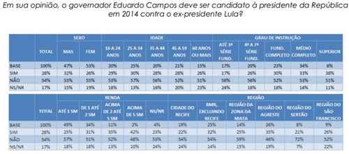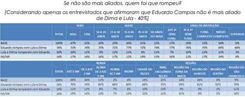 A tabela acima é importante, porque indica se o eleitor interpretará a dissidência de Campos como uma “traição” ou não, embora isso seja ligado, naturalmente, à imagem que o eleitor tenha de Lula e Dilma. De qualquer forma, está bem claro que, para grande maioria (74%), foi Eduardo Campos quem rompeu com o governo federal.