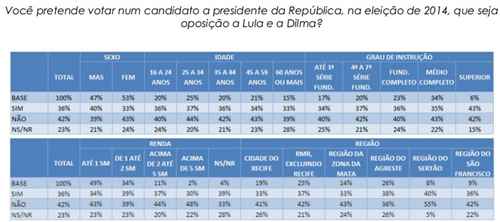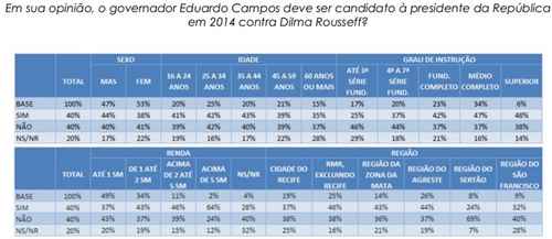 Maioria dos pernambucanos (42%) responderam não. Curioso notar que o “não” mais forte veio da faixa de renda que ganha acima de 5 salários. O Sertão também soltou um “não” bem contundente à candidatura de Campos: 55%.