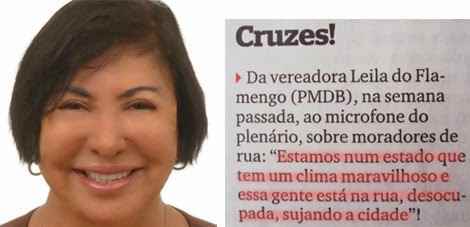 A vereadora Leila do Flamengo (PMDB-RJ) quer expulsar todos os moradores de rua que vivem no parque do Aterro do Flamengo. Em discurso no plenário da Câmara dos vereadores na última quarta-feira, a vereadora afirmou sem nenhum sinal de vergonha: “mendigo não tem o mesmo direito que os cidadãos”.