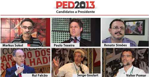 Os cinco candidatos que desafiam Rui Falcão representam diferentes tendências do que – grosso modo – poderíamos chamar de “esquerda petista”. Nos bastidores, reclama-se de filiações em massa realizadas nos meses que antecederam ao PED – e que poderiam beneficiar principalmente a candidatura de Falcão. Também nos bastidores, estima-se que Rui Falcão possa ser reeleito com algo em torno de 60% dos votos (o cálculo leva em conta o arranjo de forças do PED anterior). O grande esforço dos outros cinco candidatos é levar a eleição para um segundo turno – que hoje é considerado pouco provável.