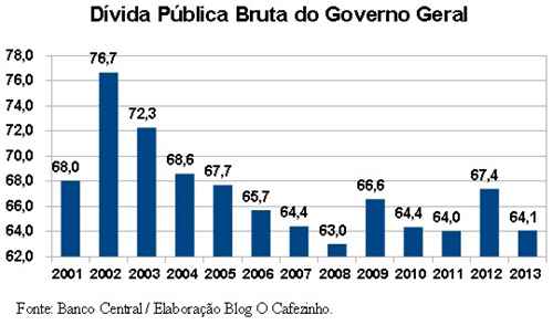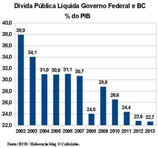 A dívida pública líquida, por sua vez, atingiu, em setembro de 2013, o mais baixo nível de sua história: 35,4% para o governo geral (União, Estados e Municípios), e 22,7% (governo federal e BC).