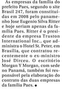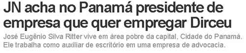 A Globo é engraçada. Fez um estardalhaço para divulgar que José Eugenio Silva Ritter, o presidente da Truston International Inc, que “administra” o Hotel St.Peter (onde Dirceu iria trabalhar, mas desistiu) é um panamenho que vive num bairro pobre da capital daquele país, mas não informa aos leitores que o mesmo Ritter foi o responsável pela constituição das empresas da família do prefeito do Rio de Janeiro. A informação seria importante para os leitores entenderem que se trata de uma “mutreta” dentro da lei, como tantas que se fazem em paraísos fiscais. Por isso estes são chamados de paraísos fiscais.