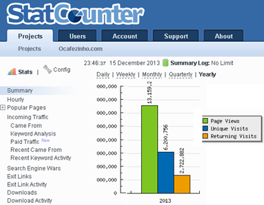 A visitação do Cafezinho cresceu substancialmente este ano. Chegamos a mais de 13 milhões de pageviews em 2013. Nossa expectativa é de quintuplicar este número em 2014, que será um ano mais quente em política por causa das eleições. Estimamos bater mais de 65 milhões de visitas no ano que vem. Temos alguns planos mirabolantes, como contratar um repórter para trabalhar em Brasília, entrevistar parlamentares, ministros, juízes e procuradores.