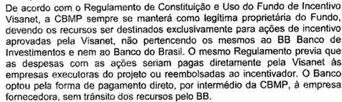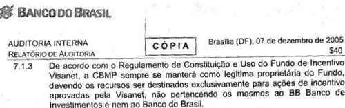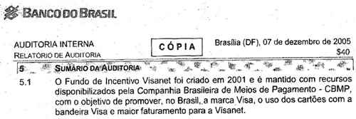 Se você analisar a auditoria verá que se trata de um trabalho rigorosíssimo, que encontra dezenas de falhas nas relações entre o Banco do Brasil, as agências e a Visanet. Mas são falhas, na maior parte das vezes, burocráticas, existentes desde a criação do Fundo, em 2001. Não se aponta nenhuma acusação de desvio, tanto que não há nenhuma orientação para que recursos sejam devolvidos, e deixa bem claro que os recursos do Fundo Visanet tinham natureza privada, pois pertenciam, única e exclusivamente, à Companhia Brasileira de Meios de Pagamento.