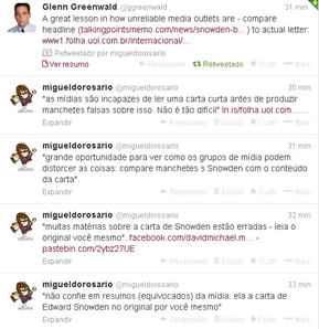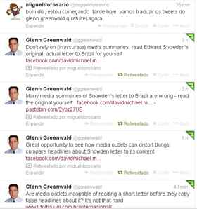 Greenwald, que é o jornalista usado por Snowden para revelar ao mundo a espionagem em escala global do governo americano, passou a manhã no twitter vociferando contra a irresponsabilidade dos meios de comunicação, que deturparam totalmente o sentido da carta. Reproduzo abaixo os tweets do jornalista, junto com outros, de minha autoria, com a tradução deles:
