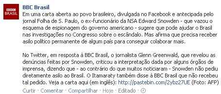 Snowden não poderia pedir asilo à Dilma (que é a única que pode tomar essa decisão) via imprensa. Em resposta à BBC Brasil, Greenwald desmente, categoricamente, o teor das manchetes dadas pela imprensa brasileira, que logo viralizaram mundo a fora: