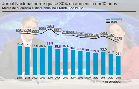Dois mil e treze vai ser o pior ano da história do Jornal Nacional. O principal telejornal do país vai fechar o ano com média de audiência em torno dos 26 pontos na Grande São Paulo, referência do mercado publicitário. Pelo segundo ano consecutivo, o JN ficará com médias inferiores a 30 pontos.