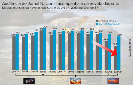 Dezembro de 2013 também deverá ser o pior mês de todos os tempos do Jornal Nacional. O noticiário da Globo sofre com o mau desempenho de Além do Horizonte. O gráfico abaixo mostra que quanto maior a audiência da novela das sete, maior a do JN. Mas se a novela das sete não vai bem, o JN cai.