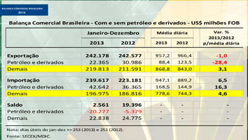 O saldo comercial de 2013, caso não fosse contabilizado o petróleo e derivados, não seria muito diferente do registrado no ano anterior.