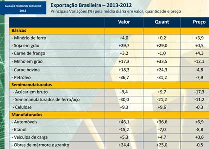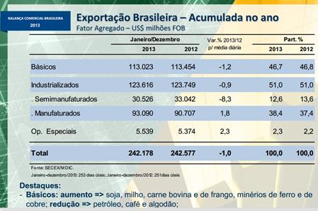 Observe que as exportações de manufaturados cresceu 1,8% em 2013, totalizando US$ 93 bilhões, ou 38,4% do total das exportações brasileiras. Em 2012, a participação dos manufaturados foi de 37,4%.