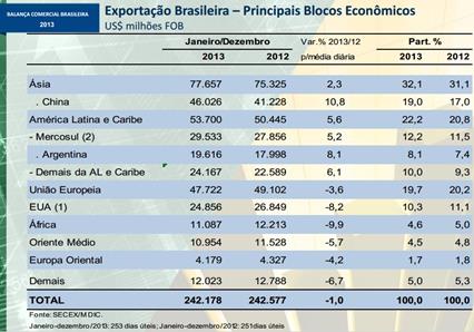 Na tabela acima, que traz os principais destinos, por bloco econômico, das exportações brasileiras, vemos que (tirante a China, que importa apenas produtos primários) a América Latina e Caribe foi o bloco mais importante para o comércio exterior brasileiro: importou US$ 53,7 bilhões do Brasil, com alta de 5,6% sobre o ano anterior.