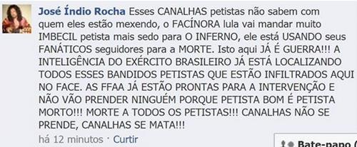 Não sei se rio, choro ou chamo a Polícia Federal. Alguns coxinhas de direita mais exaltados estão passando dos limites. Vejam o que uns amigos, que tem estômago mais forte que o meu e monitoram os coxinhas no Facebook, me mandaram.